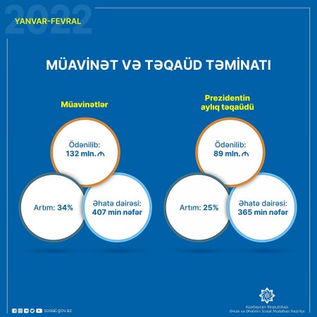Son iki ayda DSMF tərəfindən əhaliyə müavinətlər üzrə 34% çox olmaqla 132 mln., təqaüdlər üzrə 25% çox olmaqla 89 mln. manat ödənilib